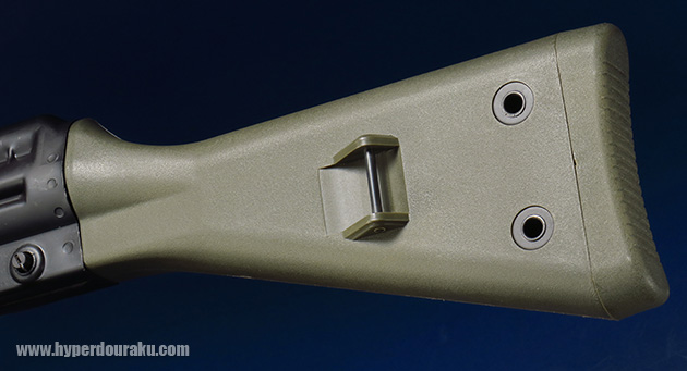 バッテリーはストック内に収納します。バットプレートの板バネとストック内の2ヵ所のピンのテンションで止まっているだけです。そのまま引っ張れば取り外せます。しっかり止まっているので脱落することもなさそうです。バッテリーは2本のピンの間にラージタイプも収納できそうな広さです。