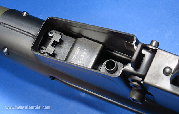 マガジンはAKのように先にマガジン前部をレシーバーに引っ掛けて装着します。マガジンとレシーバー内にあるフックを引っ掛けます。