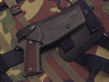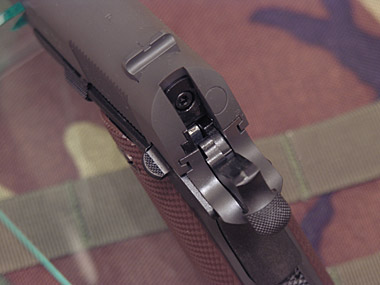 上から見てもスリムなM1911A1。これぞガバって雰囲気だ。握った感触もやはり薄く、ショートトリガーと相まって、非常に握り心地がよい。また、枕の下に忍ばせるのにも最適な薄さだw。リアサイトは別パーツだが、裏からネジ止めされている。