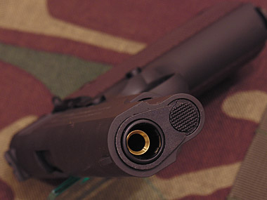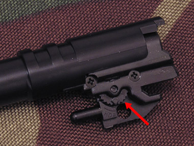 マルイガバメントの外観はかなりリアルだと言えるが、各社雑誌にはほとんどこの部分の写真が写っていない、一番納得がいかないのがココ。ファイアリングピン部分が6角ネジと言うこと。ここはハイキャパの時と同じなのだが、撃つときによく見える部分なだけに、リアルさを追求して改善してもらいたかった。