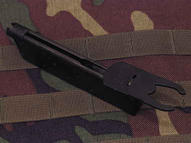 ブッシングレンチでマガジンフォロアーを引っかけて押し下げ、マガジンベースの突起に固定することで、簡単にBB弾をローディングすることができる。