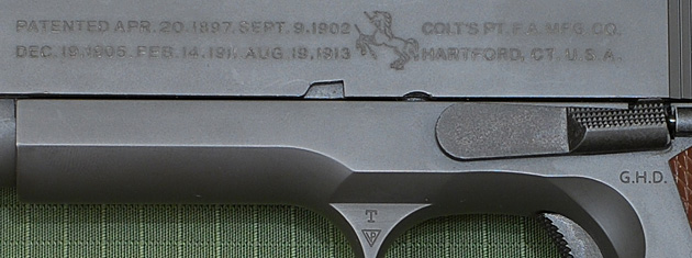 下から見たガバメント。薄い。スライド幅は実測値で23.3mm。グリップ前面はグルーブのないつるっとした仕上げ。