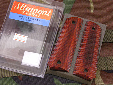 木製グリップを購入。ハンドガンのカスタムと言えば真っ先にグリップ交換。というくらい定番だ。M1911A1のグリップとしてはフルチェッカーがオーソドックス。メダリオンもない方がミリタリーっぽい。カラーバリエーションが何色かあって、この赤っぽいのと、黄色っぽいのと、黒っぽいのがあった。それぞれ購入時に組み合わせてみたが、どれも格好良く悩んだが、最も無難な感じにまとまったこの色に決定。