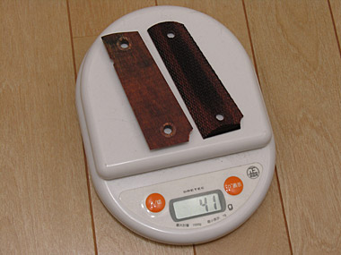 ノーマルグリップとの形状の差は、こちら側の上部の形状がアンビのロングセフティやスライドストップ用に数ミリ短くなっている。気になる重量だが、まあ確かに軽くなった。