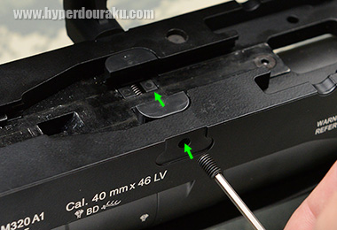 東京マルイのモデルアップしたM320A1はガスをパワーソースとしたグレネードランチャーで、専用のカートリッジ内に設けられた6本のバレル内に各3発ずつ、合計18発の6mmBB弾を装填し、ワントリガーで全18発を同時発射する仕組み。