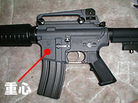 M16A2と比べるとバランスポイントが数cm前にある。これが意外と影響有りで、バットストック内臓ラージバッテリーのA2に比べたら、かなりフロントヘビー。