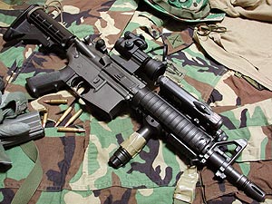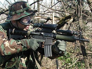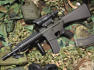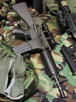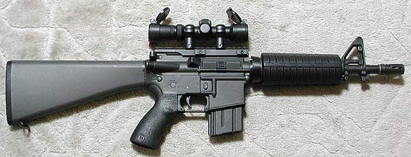 先日のサバゲーで野外撮影してみたM4A1。天候は曇り。2003年11月下旬の寒い昼に撮影。アルマイトしたアルミフレームは結構グレーに見えるが、ブラストしてあるので無光沢。チープなイメージは無い。グリップとストックは真っ黒。