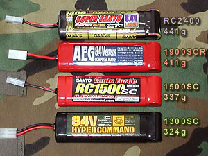 大きさはマルイ純正ラージとほぼ同寸だが全長が1mmほど長い。重量は マルイ純正(サンヨー1300SC使用)が324g、1900SCRが410g、RC2400が440gと同寸でもずいぶんと差が出ている。測ってみて気づいたが、116gの重量差は結構大きい。