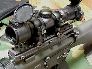 M4に装着。固定ノブがデカイ。 マウント込みの重量は352g。トリジコンTA11タイプのスコープより約100g軽量だが、マルイ純正ダット+ハイマウントより100g重い。