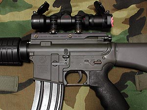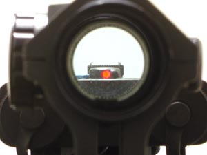 このようにフロントポストはほとんど見えなくなる。ダットの光点はフロントサイトピンの中心にあるのだが、AN/PEQ-2のネジ頭に隠れている。ドットサイトは両目でサイティングするので、視界が広く取れ、使えないこともないが、気になる場合はさらに高いマウントが必要。その場合はもちろんアイアンサイトの照準線からはズレる。