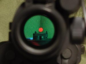 サイティングするとこのように照準線よりほんの少し高い位置にダットが輝く。肉眼ではダットはもう少し小さく見える。光点はギラっとしている。