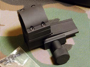 付属のローマウントでは照準線より下がってしまうので、L型ハイマウントを購入。これもエイムポイントのセカンドバージョンレプリカ。ゲタパーツを取り外すことでハイポジションからローポジションにも使用可能。