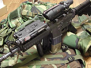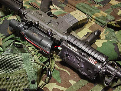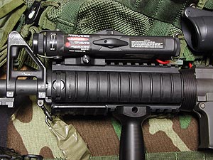 AN/PEQ-2は数社から、発売されているが、形状がリアルと評判のアングス製の組み立てキットをチョイス。組み立てに際しては各パーツのバリを取るのが面倒。またパーツの梱包間違いなどもあって、ちょっと手こずったが、1時間ほどで組み立て・塗装を完了。数年もすれば、もっと小型のレーザーサイト(PEQ-5あたり)が米軍で普及するであろう虚しさを予感しながらRISに装着。