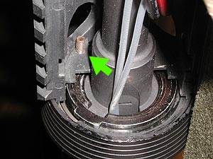 赤い矢印の部分に、スイッチ接点用の突起があり、この部分に対物側からの光が反射して対物レンズの左下に乱反射を映し出していると思われる。無反射処理するべきでしょう。