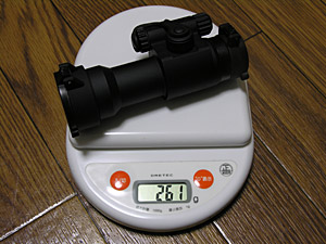 今までフリーダムのEXマウントにタスコのマウントリング、ハッコーのTAC-2628を使用していた。そうすると合計重量が、244g+121g+90gで455g。これを、ACUPOINTとオフセットマウントの組み合わせにすると261g+113gで374gと81gの軽量化になる。30mmストレートマウントならば100gの軽量化になる。