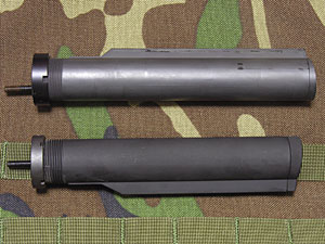 激震祭などでストックパーツを見ていると、どうやらストックチューブは実物でもGUARDERのタイプがあることが解った。つまりマルイ互換と実物互換の2種類があるというコトになる。ただGUARDERの場合、for MARUI Originalと言い切っているところが最低。で、軽量なGUARDER製を是非取り付けたい、ということで、G&Pのコルトストックを削ってみることにした。