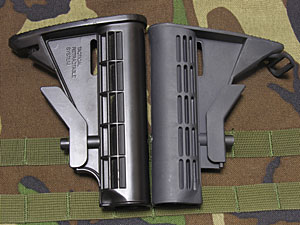 左のライラクスのLEタクティカルストックと比較すると1cmほど短い。と言うよりはライラクスの方が長いのだが。全体の色味はやや明るめのグレーで、触った感じはざらっとしている。