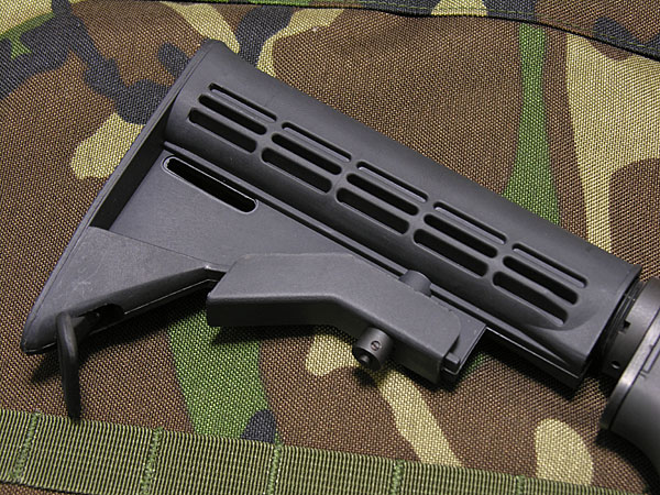ストックを一番縮めた状態。ノーマル長の5ポジションストックなので、凹みができる。