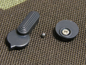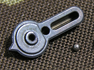 フレームの穴問題は削って何とかなったが、取り付けを断念せざるを得なかった原因はこの写真。プレート側とコネクトする部分のモールドが薄く、角が丸まっている。このためプレートとネジ止めしてもセレクターの回転と追従しない。見事なスチールブルーの質感だけにこれは惜しい。是非とも改良して欲しい。クリック感を出すためのボールベアリングも外れやすく紛失しやすい。全体的に明らかに設計ミス。