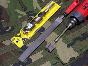 用意したのは左の写真の工具類。内面の角を削るための長い平ヤスリと、ストックチューブ径もマルイの29.0mmに対してGUARDERは29.8mmと径が大きいので、内径を広げるためのフラップホイル(円筒形の紙ヤスリ)と奥まで届くようにエキスパンションシャフトを揃えた。また、念のため30mm径のドリルも用意したがこれはほとんど使わなかった。だいたいストレス無くストックを伸縮するには内径30mm程度に広げる必要がある。
