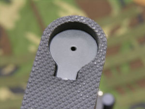 刻印はシステマに比べ太く、はっきりとしている。写真のマガジンキャッチはG&Gのスチール製(正確には粉末冶金、焼結合金ともいう)に換装。これがなかなか良い。