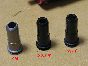 KMのカスタムノズルを組み込んでみた。先端がラウンドカットされているのが特徴。段差の位置が違うのが気になる。 左からKM企画製ラウンドカスタムノズル、システマ製エァ・シール ノズル、マルイ純正。