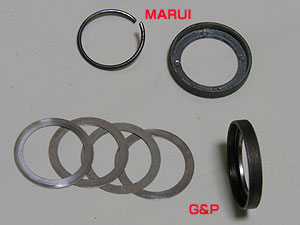 マルイ純正のハイダーワッシャーは写真のようにスプリングと凹みのあるリングで構成される。これが厚みがあり、何とも「もっさり」とした印象を与えてしまう。G&Pも同じ構造で、ハイダー角度調整用のワッシャーが付属するがマルイ同様のためやはりカッコ悪い。