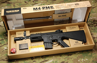 東京マルイのM4-P.M.C.は2008年5月に開催された静岡ホビーショーにて発表されたM4系スタンダード電動ガンの最新作。その名が示すようにPMC(プライベート・ミリタリー・カンパニー)、つまり民間警備会社のオペレーター達が使用するという設定のカスタムM4だ。軍で使用される通常のM4カービンが14.5インチバレルなのに対して、このM4-P.M.C.は6.5インチと極端にフロントを切り詰めたショートスタイルとなっているのが特徴。これは自動車の中や警備対象となる要人を含む人が多くいる場所、室内などの狭い場所でも安全に取り回ししやすいように工夫されたものだ。