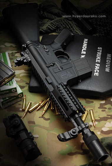 Hk416タイプのショートフィクスドストック、20連型のショートマガジン、フリップアップ式のフロント、リアサイトはSシステムと同様だが、このスタイルによく似合っている。