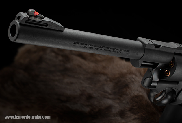 溝のないノンフルーテッドシリンダーや、フレームにもRUGERの刻印が入る。なんといってもブラックヘビーウェイト樹脂の質感や手にしたときの1.2kg越えの重量感はたまらないものがある。