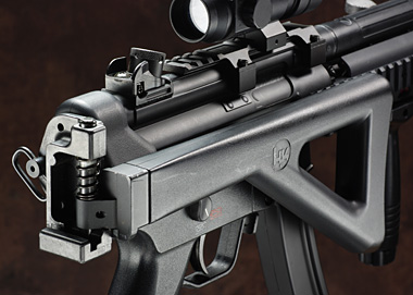 MP5 PDW同様のフォールディングストックだが、ストック基部のレシーバーキャップ分が約1cm長く、グリップまでが遠く感じる。