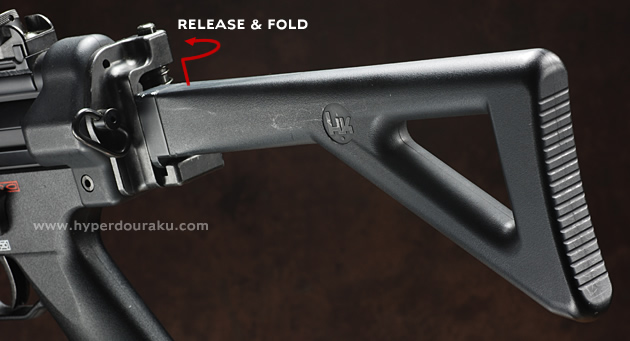 さらにMP5 R.A.S.のもうひとつの特徴として、折り畳み可能なフォールディングストックを装備する。ストック部分の素材は軽量なプラ製だが強度も十分だ。ストックを折りたたむには赤矢印のようにストックを持ち上げロックを外し、右側面へスイングする。