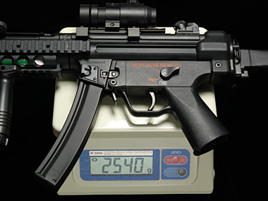 ドットサイト、フォアグリップ、50連マガジン、ニッケル水素ミニバッテリーを装着しての総重量は2,540g。