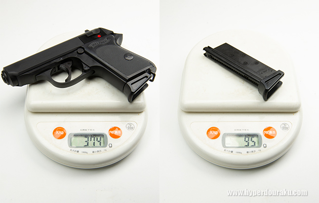 実測重量は374g、マガジン単体では95g。サイドアームとして持っていても苦にならない軽さ。