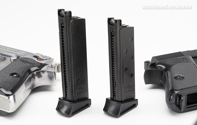 グリップの長さにあわせてマガジンも短くなっている。亜鉛ダイキャスト製マガジンはPPK/sが装弾数22発に対して、PPKは18発。PPK/sのマガジンをPPKに使ってみたところ、一応動いたが、ちょっと動作が不安定だった。