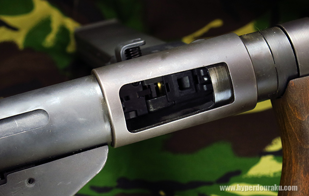 実銃と同様、作動方式はオープンボルトです。コッキングハンドルで、ボルトが後退位置でスタンバイ状態です。引き金を引いて、ボルトが前進して発射します。