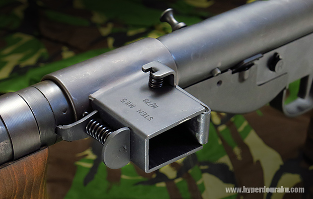 ステンの発射方式はオープンボルト式で、弾薬は新規開発せず、ドイツ軍と共通の9mmパラベラム拳銃弾を使用します。