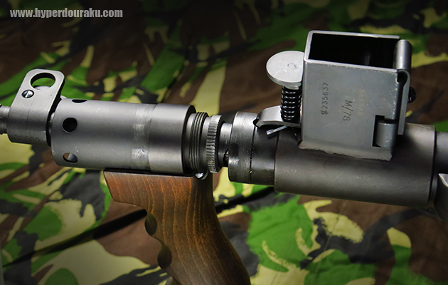 リアサイトはピープ式です。割り切ったデザインで、いかにも簡略化と生産性重視という設計を感じられます。