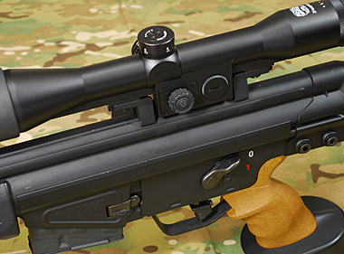 スコープはレシーバー上面のマウントにネジで直付けされている。側面のダイヤルは回転するがダミーパーツ。