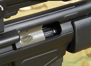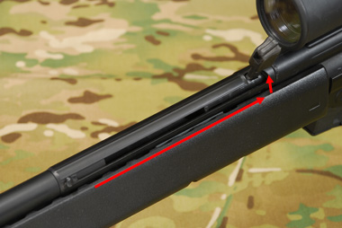 コッキングレバーに連動しダミーボルトが後退、バレル同軸式のホップアップダイヤルが現れる。この辺はG3系同様の機能だ。またこのダミーボルトは射撃するとこの位置まで「カシャコン」と可動する。次世代電動ガンのシュート&リコイルシステムの先駆けともいえる。