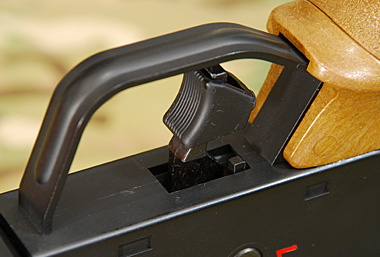 上下に調節可能なトリガーシューが装着され、指を添えたときの感触が良い。トリガー根元にある小さい突起は後退したピストンを強制的に前進させるためのレバー。