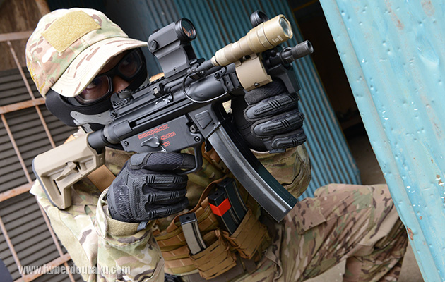 で、セフティに戻って仲間のメインウエポンをチラチラと横目で伺うと、MP5クルツを使っている。しかも一人ではなく、数人のメンバーがテーブルサイドに備え付けられたガンラックにフォールディングストックを伸ばして立てかけている。