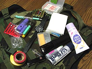 ![]() LUMINOX-3001(ルミノックス)腕時計、ミニMAGライトLED仕様、WAシリコンオイル、ウェンガー折り畳み10徳ナイフ、カラービニールテープ(赤・黄)、軍用ホイッスル、交換用ヒューズ(15A)、6角レンチセット、ドライバーセット、単3電池×8本、ボールペン、ポケットティッシュ、ゴーグル曇り止めスプレー、虫除けジェル、絆創膏、頭痛薬。 |