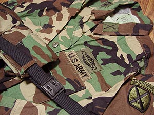 ![]() BDUはウッドランドの実物新品95~96年製。50%コットン、50%ナイロン、リップストップ。インシグニアは陸軍章、第10山岳歩兵師団肩章、大尉襟章、戦闘歩兵章。BDU上下各\4,500/ウエマクラブ。BDUベルトは黒の実物官給品(東京キャロル/\1480)。 |