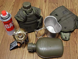 ![]() 1クォートキャンティーン(02年製/ファントム/\1,300)×2、ナイロンキャンティーンカバー(86年製/中田商店/\1,300)、キャンティーンカップ(ファントム/\1800)、UNIFLAMEミニバーナーUS-600、イワタニガスボンベ。昼食にカップ麺を食べたいときや、冬場に熱いコーヒーが飲みたい場合に持って行く。 |