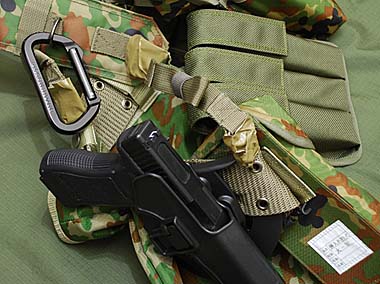 BLACKHAWK!のカラビナをサスペンダーに引っ掛けてゴーグルを外したときに引っ掛けるようにしている。ハンドガンは電動グロック18CをCQCホルスターに入れている。マグダンプポーチはJ-FORCE。 |