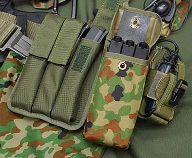 MP5のマガジンはイーグル模型のレッグポーチなども試したがやはり腰周りにあったほうがしっくりくる。左がイースト.AのマガジンポーチNo.309、右がターゲットの89式マガジンポーチ2本用。これにMP5のマガジンが3本ぴったり入る。マグフォースのラジオポーチ。 |