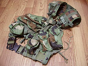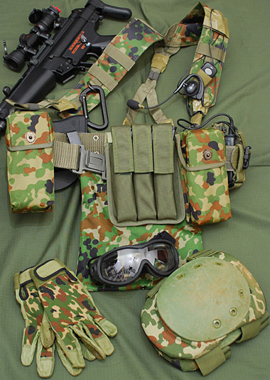 2007/06/03時点での装備。自衛隊迷彩を使用して2年ほどになるが、やはり日本の植生にあっていて、ゲームで非常に重宝している。また、最近MP5を使用しているのでマガジンポーチなどの選択に苦労した。豚革のヒメジグローブ。ROTHCOの新迷彩柄ニーパッド。背面に見えないがハンドガンマガジンポーチに予備のミニバッテリーを入れている。 |