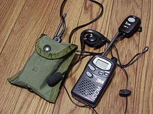 ![]() 無線はiCOMの特小、IC-4008Wにスイッチボックス+ブームマイク。実物ナイロンコンパスポーチ(ファントム/\500)に穴を開けて本体を収納。 |