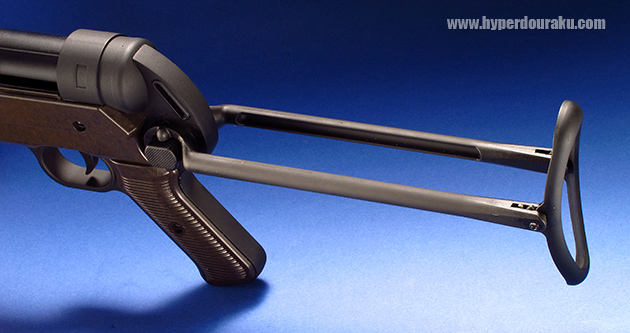 ストックを伸ばしてカチリトロックされたら、あとはショルダーパッドを起こせば完了です。アルミ製でガタつきは一切ないがっちりした作りとなっています。 ストックを折りたたむときも同様にストックリリースボタンを押して逆の手順を踏みます。